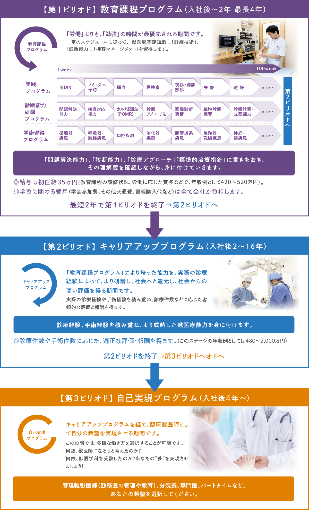 ファニメディック動物医療グループでは、十分な知識と豊富な臨床経験を持つ獣医師を、1人でも多く育てていくこと、経験や知識の備わった獣医師に更に成熟した獣医療能力をつけてもらうこと、そんなキャリア形成を支援するために、成長できる学べる環境やキャリアプログラムがあります。